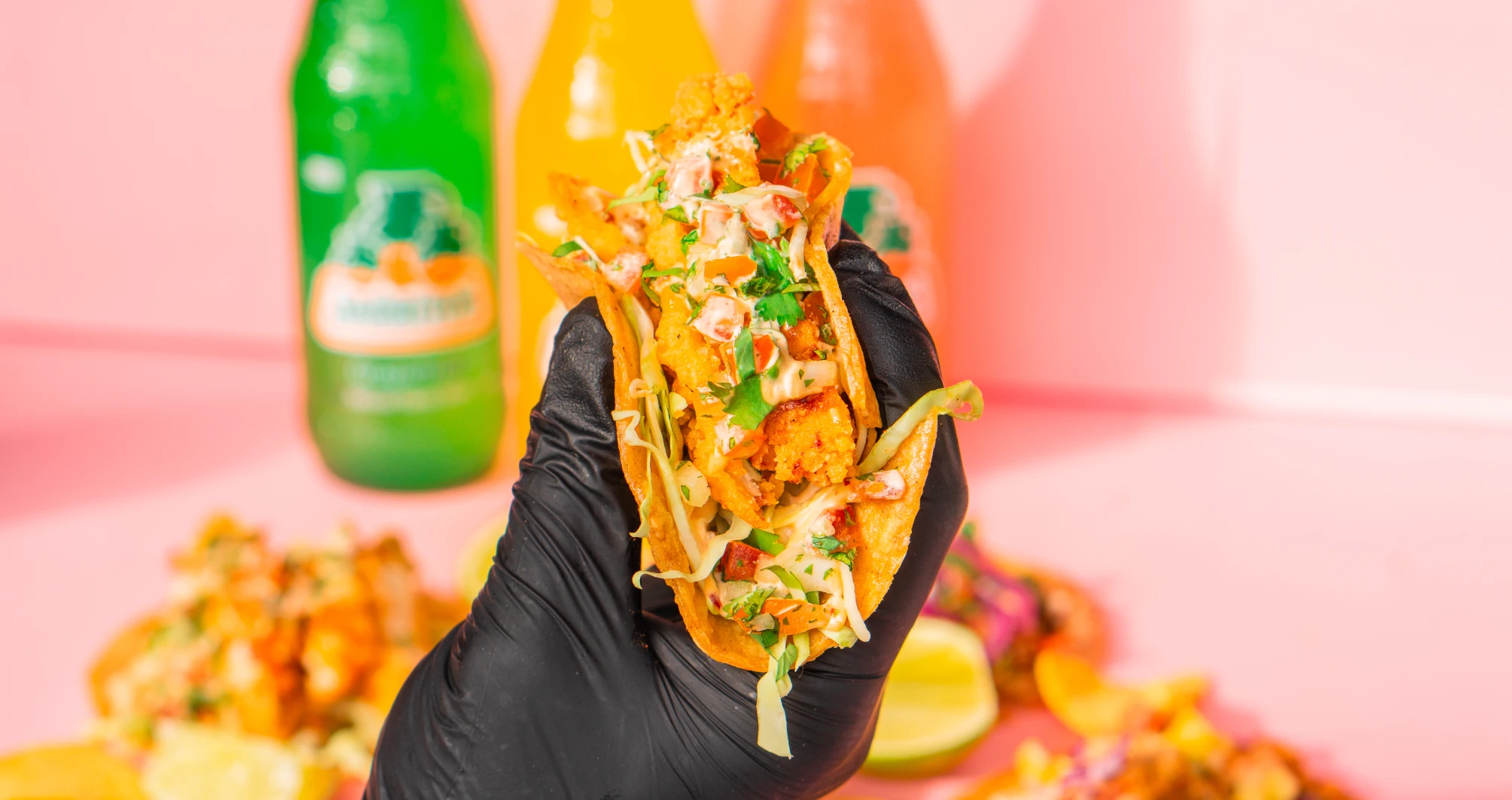 Pollo Crujiente Taco: Sprød crispy kylling, komplementeret af en dressing lavet af en blanding af friske tomater og krydderier. Toppet med livlig pico de gallo, et strejf af lime og snittet hvidkål.